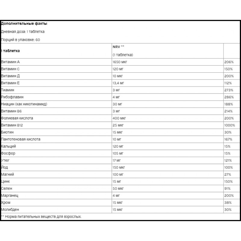 Ингредиенты: кальциевые соли ортофосфорной кислоты, наполнитель (гель целлюлозы), оксид магния, L-аскорбиновая кислота, фумарат железа, никотинамид, оксид цинка, ретинилацетат, цианокобаламин, сульфат марганца, D-пантотенат, кальций, холекальциферол, тиамина мононитрат, гидрохлорид пиридоксина, рибофлавин [рибофлавин, наполнитель (гидроксипропилметилцеллюлоза)], птероилмоноглутаминовая кислота, йодид калия, селенит натрия, хлорид хрома (III), молибдат натрия (молибден, биотин (VI)), DL-альфа-токоферилацетат, материал покрытия [стабилизаторы (поливиниловый спирт-полиэтиленгликоль-привитой сополимер, поливиниловый спирт), тальк, моно- и диглицериды жирных кислот], магниевые соли жирных кислот, диоксид кремния.
