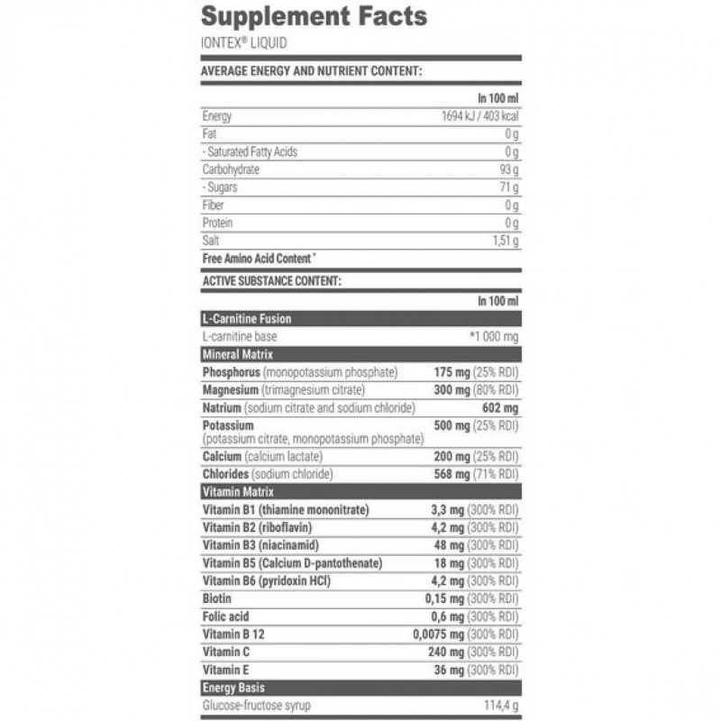 В качестве источника энергии Iontex Liquid содержит глюкозо-фруктозный сироп с добавлением 1000 мг карнитина, вещества, традиционно используемого в спортивном питании, и сбалансированный комплекс из 6 необходимых минералов и 10 витаминов, которые логически составлены в соответствии с рекомендуемыми суточными дозами (RHP). Iontex ® Liquid предлагает вам Extrifit в десяти восхитительных вкусах: апельсиновый сок, ананасовый сок, мохито, лимон-лайм, киви, розовый грейп-помело, малиновый лимонад, вишня, мандариновый сок и зеленое яблоко. Все они очень вкусные!