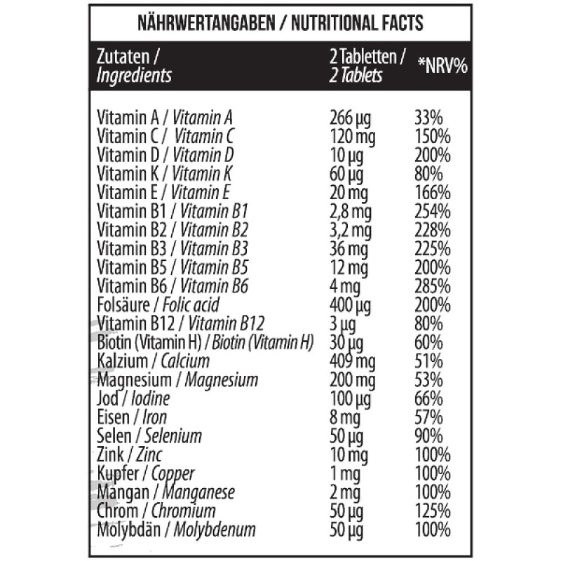 MST® ALL VITAMINS – это универсальный комплекс из 13 витаминов и 11 минералов в таблетках от немецкого производителя спортивного питания компании MST Nutrition. Мощный, максимально полный, сбалансированный витаминно-минеральный комплекс создан специально для поддержания организма при высоких физических нагрузках. Все составляющие повышают выносливость, тонизируют и придают сил, помогают повысить жизненный тонус, сокращают утомляемость и усталость.