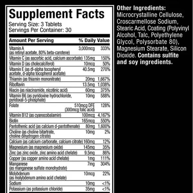 Платиновый мультивитамин Essential Series от Muscletech — высокоэффективная витаминно-минеральная добавка к пище, разработанная специально для спортсменов, бодибилдеров и людей, ведущих активный образ жизни. Препарат содержит 18 биологически активных веществ, микро- и макроэлементов, а также аминокислоты, экстракты целебных трав и смесь полезных ферментов. Он обеспечивает организм энергией, поддерживает высокий иммунитет: улучшает работу нервной, сердечно-сосудистой систем, головного мозга, опорно-двигательного аппарата; стимулирует рост мышц, помогает быстрее восстанавливаться после тренировок, снижает риск спортивных травм. В одной упаковке 90 таблеток. Это количество рассчитано на месячный курс приема.