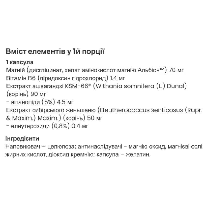 Дополнительно присутствует экстракт женьшеня и ашваганды, которые придают адаптогенные свойства, защищая организм от стрессовых ситуаций и укрепляя общее состояние организма.