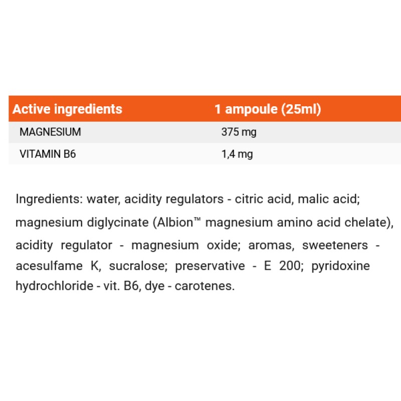 1 ампула обеспечивает организм необходимой суточной дозой магния и витамина В6 (375 мг магния + 1,4 мг В6). Chela-Mag B6® Forte Shot содержит гипоаллергенный, легко усваиваемый органический хелат аминокислот магния AlbionTM TRAACSTM, который обеспечивает в 3-8 раз более быстрое усвоение по сравнению с другими неорганическими формами Mg.