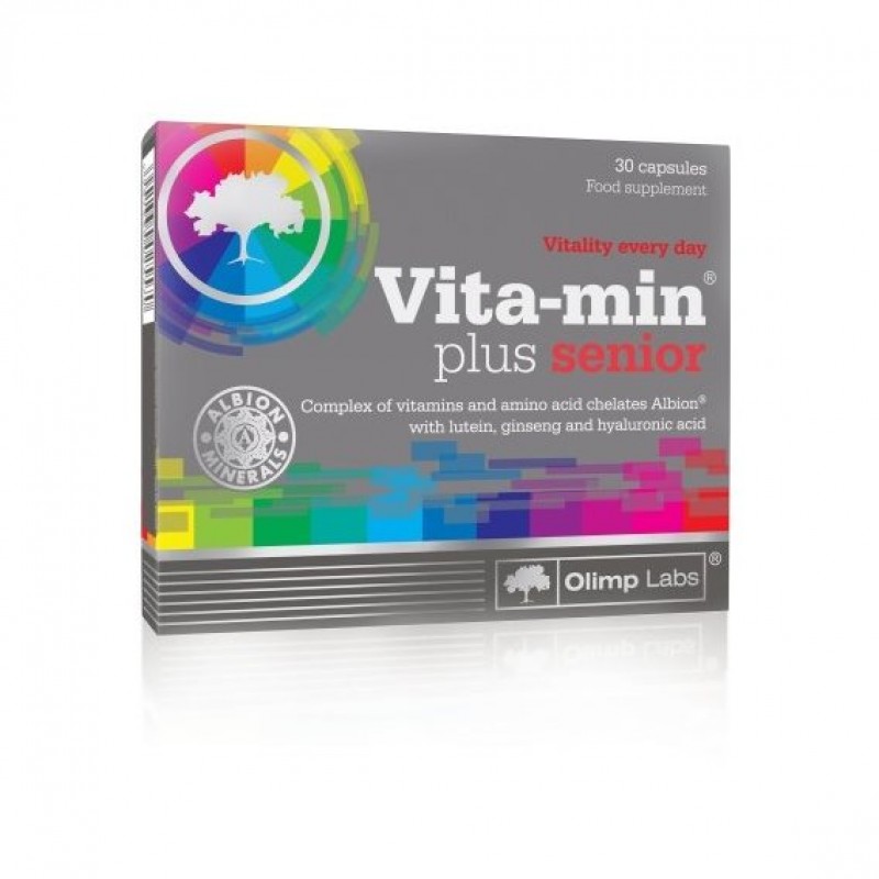 В Vita-Min Plus Senior Olimp (витамин-мин плюс для мужчин) включены следующие нутриенты: витамины и минералы в высокой концентрации, что необходимо для полного покрытия суточной потребности в них организма пожилого человека (не способного к полноценному усвоению нутриентов) и спортсмена, потребность которого вдвое выше обычной. Также в состав входят экстракт корня женьшеня, лютиен и гуалироновая кислота.