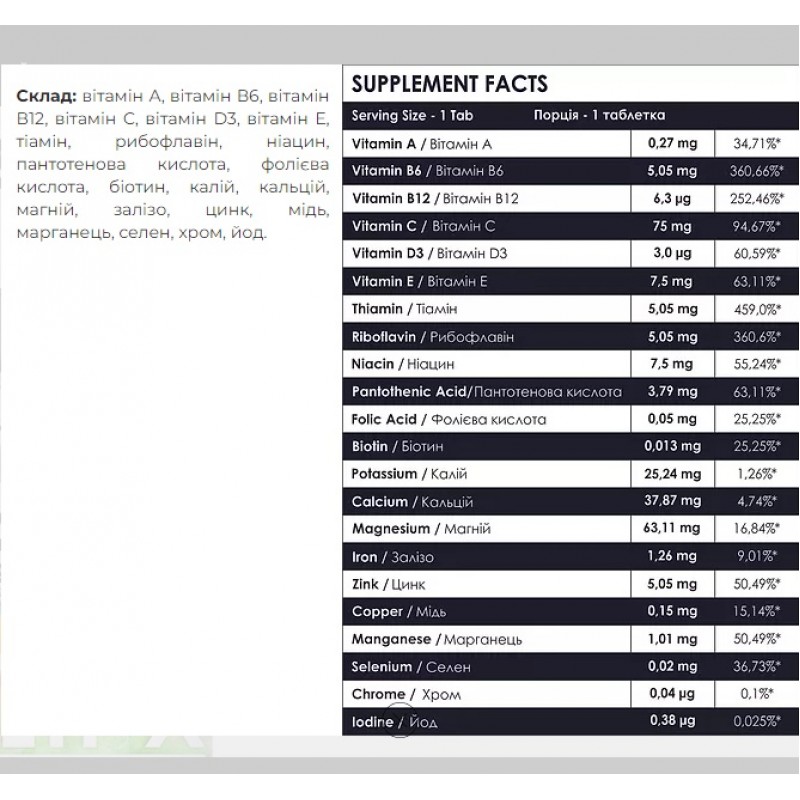 В каждой таблетке содержится целый комплекс необходимых полезных веществ. В состав MULTI-X входят 6 витаминов (A, В6, В12, С D3, и Е) и 16 видов таких бесценных минералов как кальций, фосфор, магний, цинк, селен, йод, рибофлавин и многие другие.Особенно стоит отметить, что в каждой таблетке Multi-X содержится 100% суточная норма витаминов B6 и B12, которые играют важную структурную и функциональную роль в организме человека, в частности обеспечивают жизнедеятельность клеток, роста и развития тканей.