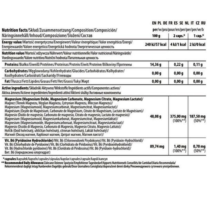 Trec Magne-100 Sport - высококачественный капсулированный комплекс четырех форм магния и пиридоксина гидрохлорида, улучшающего усвоение магния.