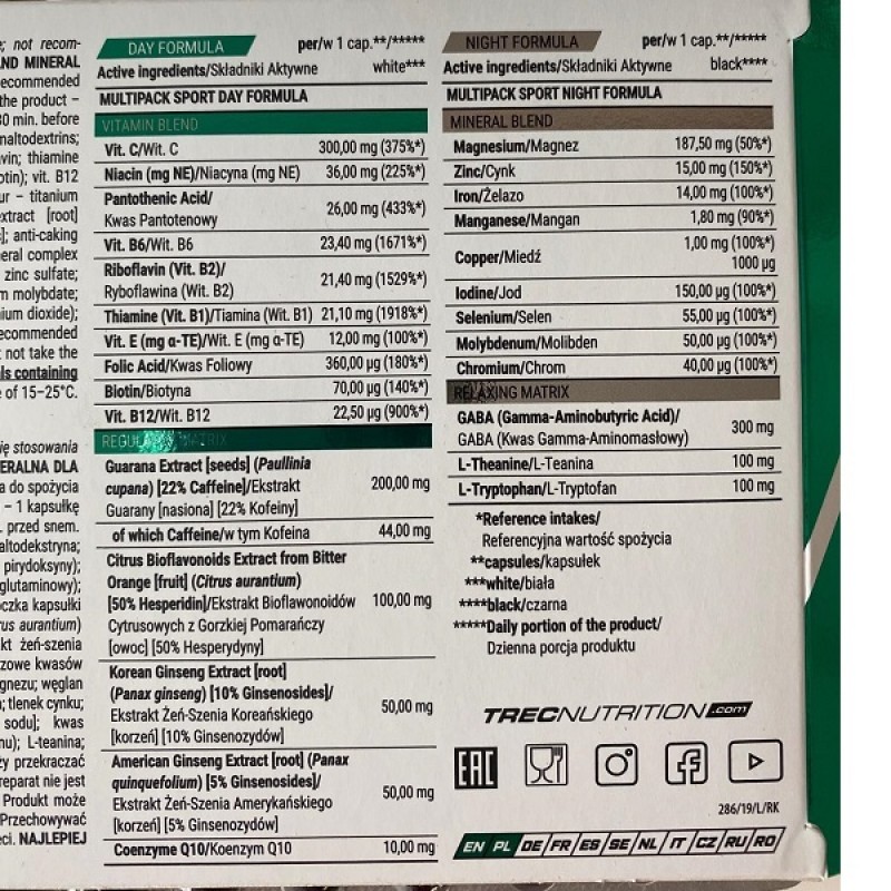 Multi Pack Sport Day/Night от Trec Nutrition - это польская пищевая добавка в форме капсул, чудесный мультивитаминный комплекс для спортсменов, обогащенный минералами, травяными экстрактами-стимуляторами, аминокислотами и коэнзимом Q10. Все необходимое для активных спортивных людей собрано в одном продукте для: