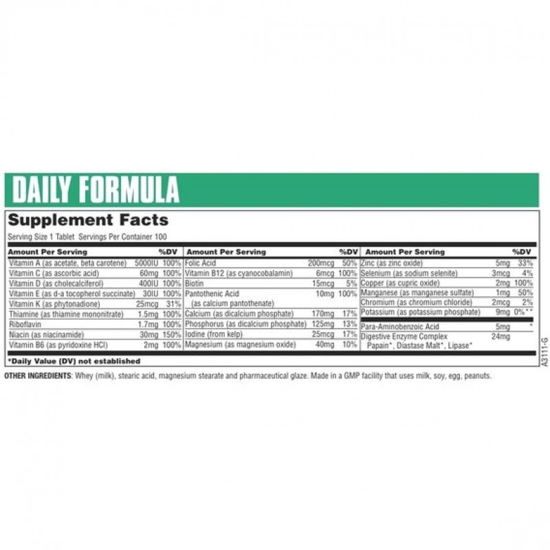 - Поскольку в Daily Formula Multivitamins содержится полный набор полезных макро- и микроэлементов, то его могут принимать и люди, которые не занимаются спортом и не ведут активный образ жизни. Ведь в большинстве случаев наш организм не получает нужные вещества в полном объеме. А этот витаминный комплекс поможет восполнить их не хватку, улучшить иммунитет и общее состояние здоровья.
