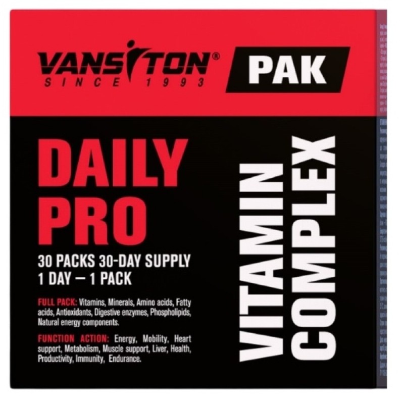 DAILY PRO PAK VITAMINS №30 Vansiton — мультифункциональный комплекс, который специально разработанный для спортсменов и людей с повышенными физическими нагрузками. Он включает в себя широкий спектр витаминов, минералов, аминокислот и других полезных компонентов, способствующих оптимальному функционированию организма и поддержанию высокого уровня продуктивности при активном образе жизни.