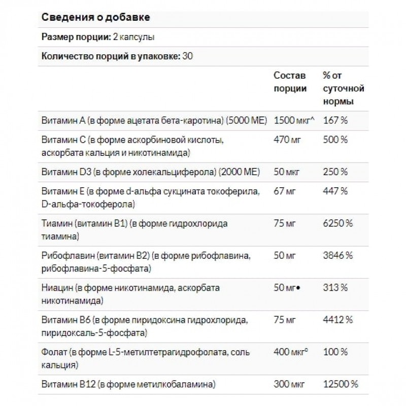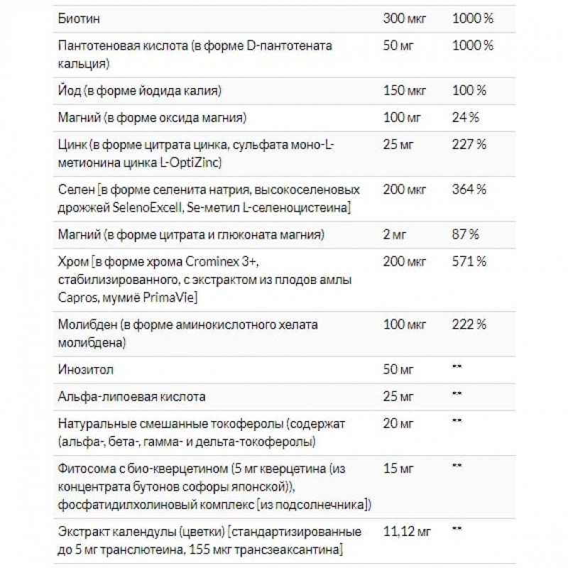 5-MTHF — Two-Per-Day от Life Extension содержит 5-метилтетрагидрофолат (5-MTHF), активную форму фолата, которая в 7 раз превосходит по биодоступности фолиевую кислоту. Эта высокая доступность особенно важна для людей с генетически обусловленным дефицитом фермента, так как такая форма не требует трансформации, чтобы стать метаболически активной. Дополнительные высокоэффективные минералы и антиоксиданты Мультивитаминный комплекс не может быть полноценным без минералов и ряда антиоксидантов, необходимых для крепкого здоровья. Формула Two-Per-Day от Life Extension содержит в 10 раз больше биотина и в 4 раза больше селена, чем Centrum Silver Adults 50+. Альфа-липоевая кислота — Альфа-липоевая кислота укрепляет здоровье печени, нервную систему и многое другое. Кроме того, этот универсальный антиоксидант, который помогает поддерживать уровень глутатиона на нормальном уровне. Данная формула также содержит такие пищевые ингредиенты как цитрат цинка и натуральные токоферолы (витамин Е) для лучшей абсорбции и биодоступности.