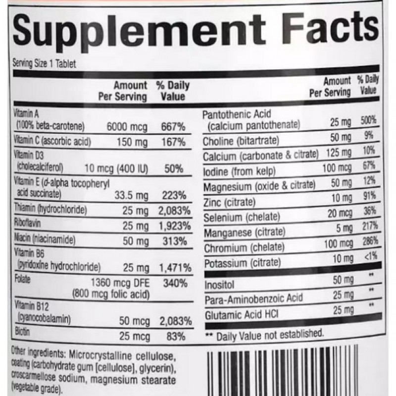 Комплекс мультивитаминов без железа – полная энергетическая и мультивитаминная защита организма. Дает возможность восполнить организм витаминами, минералами, антиоксидантами и травами для его комплексной защиты. Прием ежедневный обеспечивает естественный заряд энергии физической и сексуальной и помогает управлять ежедневным стрессом. При приеме мужчинами специальных мультивитаминных комплексов, как правило, восстанавливается обмен веществ в организме, исчезает усталость, повышается иммунитет. Эта формула идеально подходит для мужчин, женщин в период менопаузы и других, не требующих препаратов железа. Содержит 25 мг витаминов плюс дополнительные минералы. Может использоваться в период беременности от 1000 мкг фолиевой кислоты.