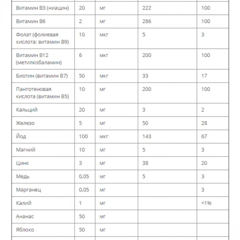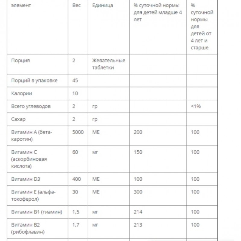 Фруктоза, лимонная кислота, ароматизатор натуральный апельсиновый, микрокристаллическая целлюлоза, натуральный цвет (аннато, куркумин, свекла), стеариновая кислота, гуаровая камедь, карбонат кальция, черной фумарат, оксид магния, оксид цинка, цитрат калия, калий йодид, стеарат магния, аскорбат натрия, не-ГМО мальтодекстрин, спирулина, шиповник, цельный коричневый рис, брокколи, шпинат, плоды манго, морковь, вишня, папая.