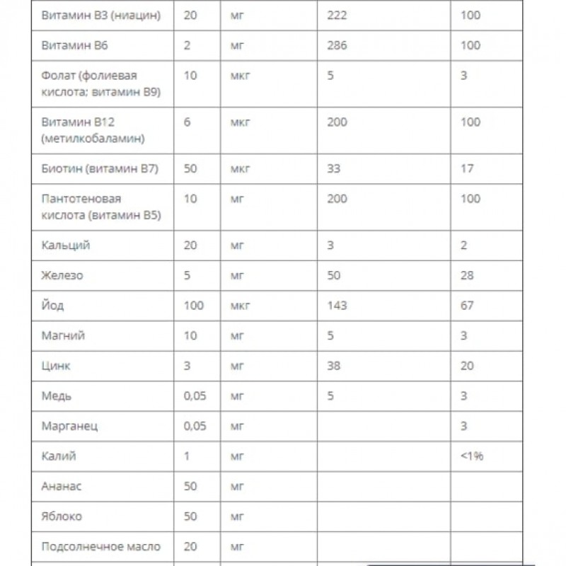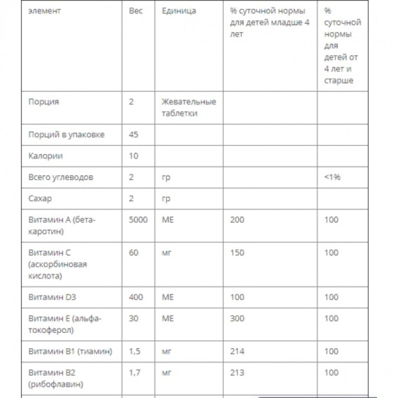 Фруктоза, лимонная кислота, ароматизатор натуральной винограда, микрокристаллическая целлюлоза, натуральный цвет (аннато, куркумин, свекла), стеариновая кислота, гуаровая камедь, карбонат кальция, черной фумарат, оксид магния, оксид цинка, цитрат калия, калий йодид, стеарат магния, аскорбат натрия, не-ГМО мальтодекстрин, спирулина, шиповник, цельный коричневый рис, брокколи, шпинат, плоды манго, морковь, вишня, папая.