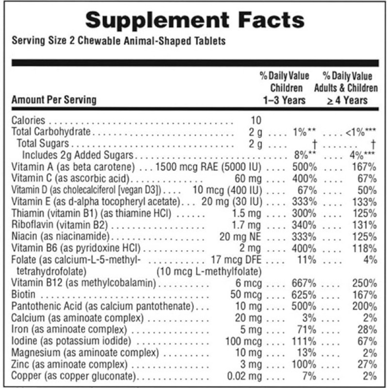 Animal Parade® GOLD Multi Kids состоит из многих полезны веществ. Витамин D3 поддерживает иммунную систему и укрепляет кости и суставы. Витамин К2 включен в формулу для поддержания кровяного здоровья. Витамины группы В помогут нервной системе справится с любыми нагрузками. Лютеин защитит глаза от повреждений и переутомлений. Также в препарат включены другие питательные вещества, которые придадут энергии и бодрости Вашему ребенку для новых открытий.