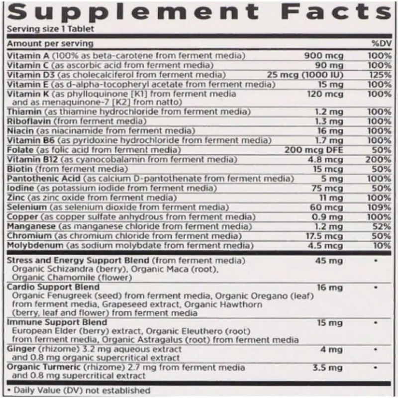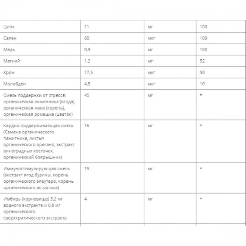 Витамины и минералы тщательно сочетаются с суперфудами и растительными экстрактами, такими как имбирь, органическая куркума и ягоды сереноа.