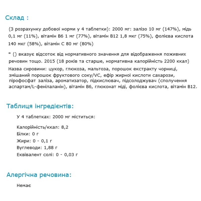 Состав: пирофосфат железа, глюкоза, мальтоза, экстракт черники в порошке, микс фруктового сока в порошке, сахар, аскорбат нартрия, эфир сахарозы и жирной кислоты, усилитель вкуса, усилитель вкуса (лимонная кислота), усилитель вкуса (аспартам/Л-фенилаланин составляющая), витамин В6, глюконат меди, фоллиевая кислота, витамин В12.