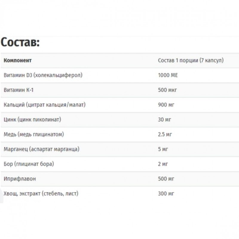 Одна капсула содержит 900 мг кальция, минерала, имеющего существенное значение для функциональности скелетной системы, а также других полезных минералов, которые поддерживают и усиливают абсорбцию кальция.