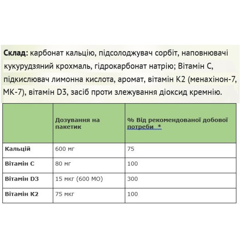 Комплекс, содержащий кальций, витамины D3, K2, С, регулирует обмен кальция и фосфора, необходим для минерализации костей и зубов, а также способствует нормальной работе мышц, свертывания крови.