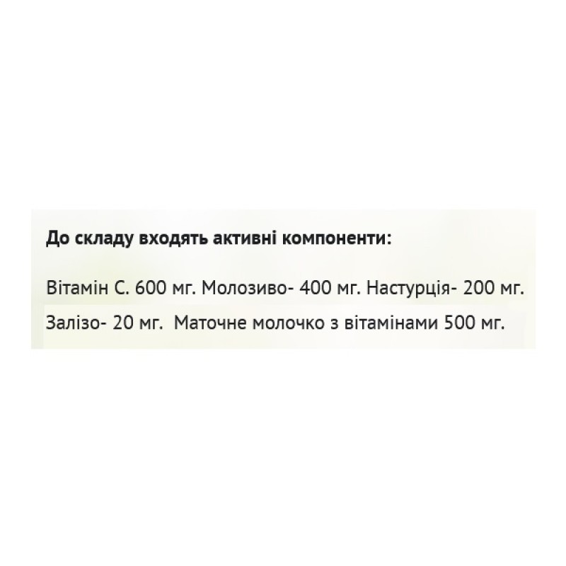 Витамин С. 600 мг. Молозиво – 400 мг. Настурция – 200 мг. Железо – 20 мг. Маточное молочко с витаминами 500 мг.