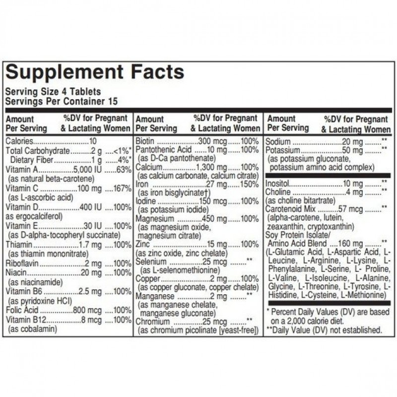 В качестве пищевой добавки для беременных и кормящих грудью женщин, принимайте по четыре (4) таблетки ежедневно, предпочтительно во время еды или по указанию вашего врача.