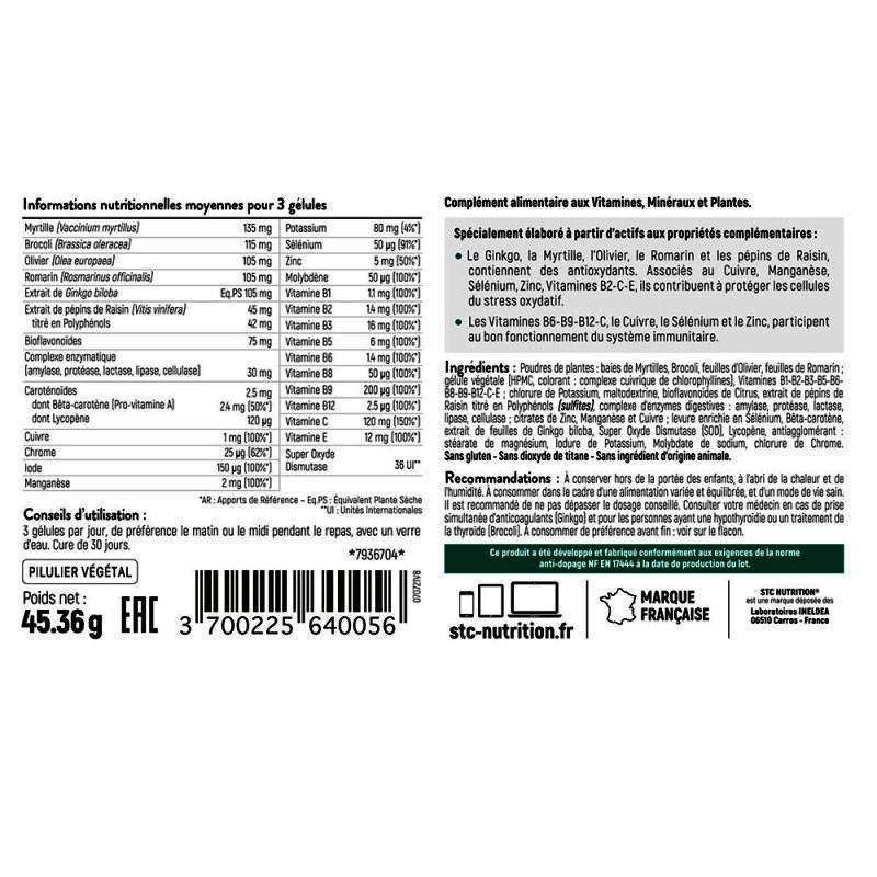 Ингредиенты: сухие экстракты растений: ягоды черники, брокколи, листья оливы, листья розмарина; растительная капсула (HPMC, краситель: медный комплекс хлорофиллинов), витамины B1-B2-B3-B5-B6-B8-B9-B12-C-E; хлорид калия, мальтодекстрин, биофлавоноиды цитрусовых, экстракт виноградных косточек, титрованный в полифенолы (сульфиты), комплекс пищеварительных ферментов: амилаза, протеаза, лактаза, липаза, целлюлаза; цитраты цинка, марганца и меди; дрожжевой селен, бета-каротин, экстракт листьев гинкго билоба, супероксиддисмутаза (SOD), ликопин, вещество против слеживания: стеарат магния, йодид калия, молибдат натрия, хлорид хрома.