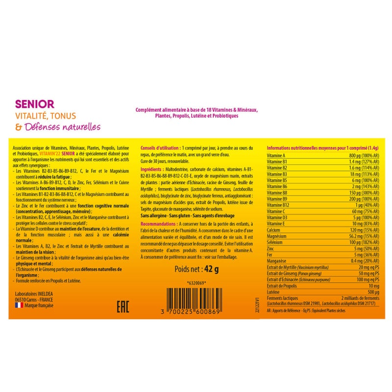 Витамины A, B6-B9-B12, витамин C, витамин D, цинк, железо, селен и медь поддерживают иммунную функцию. Эхинацея и женьшень способствуют надлежащему функционированию иммунной системы и поддерживают естественную защиту организма. Формула также усилена прополисом. Vitamin'22 Senior также содержит пробиотики (Lactobacillus rhamnosus, Lactobacillus acidophilus) для укрепления микробиоты кишечника.