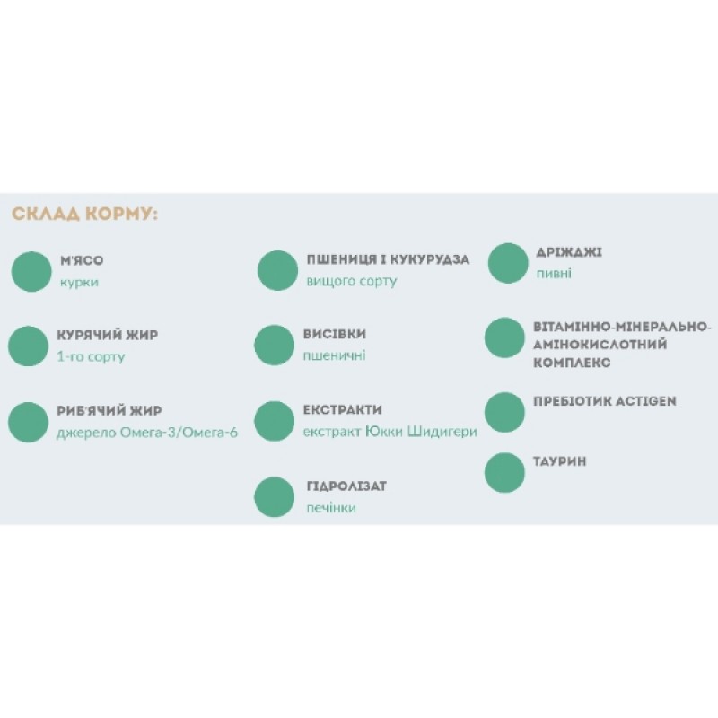 Благодаря добавлению витаминно-минерально-аминокислотного комплекса именно в хелатной форме в рацион котов и кошек, замедляется образование зубного налета и камня. Также этому способствует специально разработанная гранула корма, которая повышает поедаемость и улучшает пищеварение