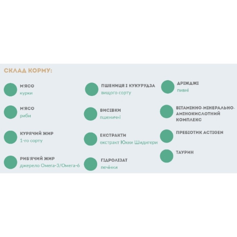 Благодаря добавлению витаминно-минерально-аминокислотного комплекса именно в хелатной форме в рацион котов и кошек, замедляется образование зубного налета и камня. Также этому способствует специально разработанная гранула корма, которая повышает поедаемость и улучшает пищеварение