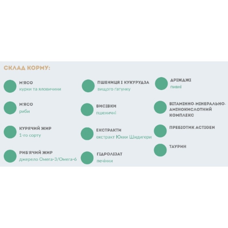Благодаря добавлению витаминно-минерально-аминокислотного комплекса именно в хелатной форме в рацион котов и кошек, замедляется образование зубного налета и камня. Также этому способствует специально разработанная гранула корма, которая повышает поедаемость и улучшает пищеварение