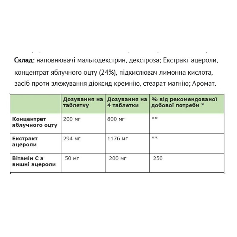 Каждая жевательная таблетка содержит природные компоненты 200 мг концентрата уксусного уксуса, а также 50 мг природного витамина С вишни ацерола для поддержания защитных сил вашего организма.