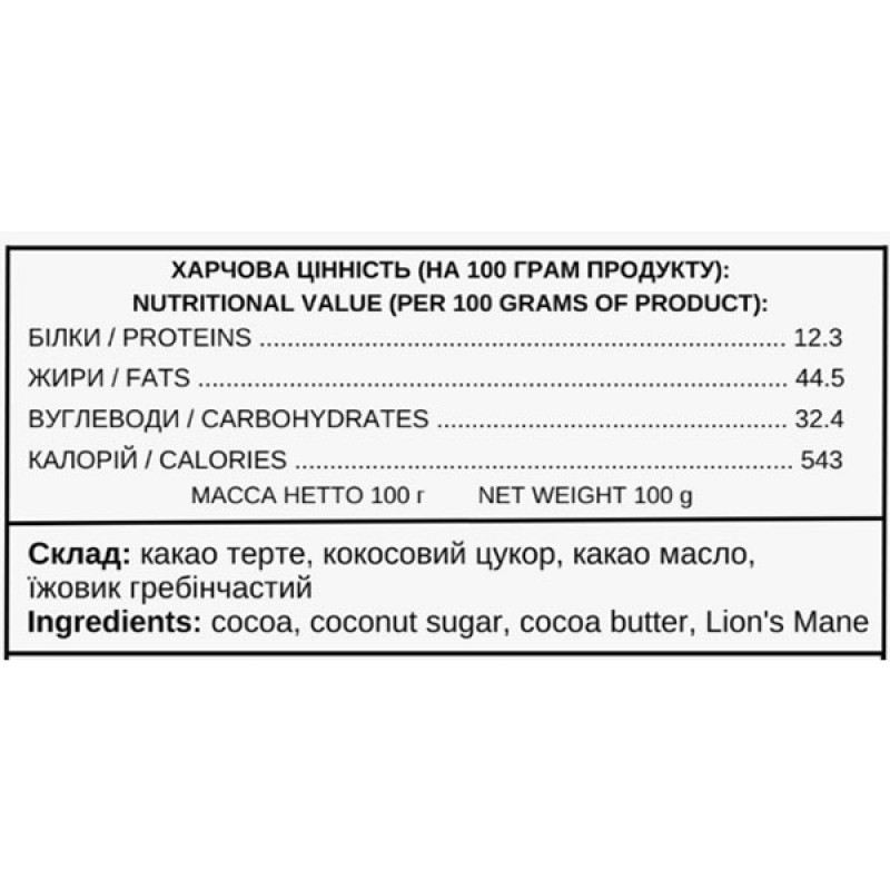 Ежик гребенчатый содержит полисахариды и гериценоны, которые способствуют регенерации нервных клеток и стимулируют нейропластичность. Какао придает энергию и антиоксидантную защиту, а кокосовый сахар обеспечивает стабильный уровень глюкозы в крови, не вызывая резких скачков.