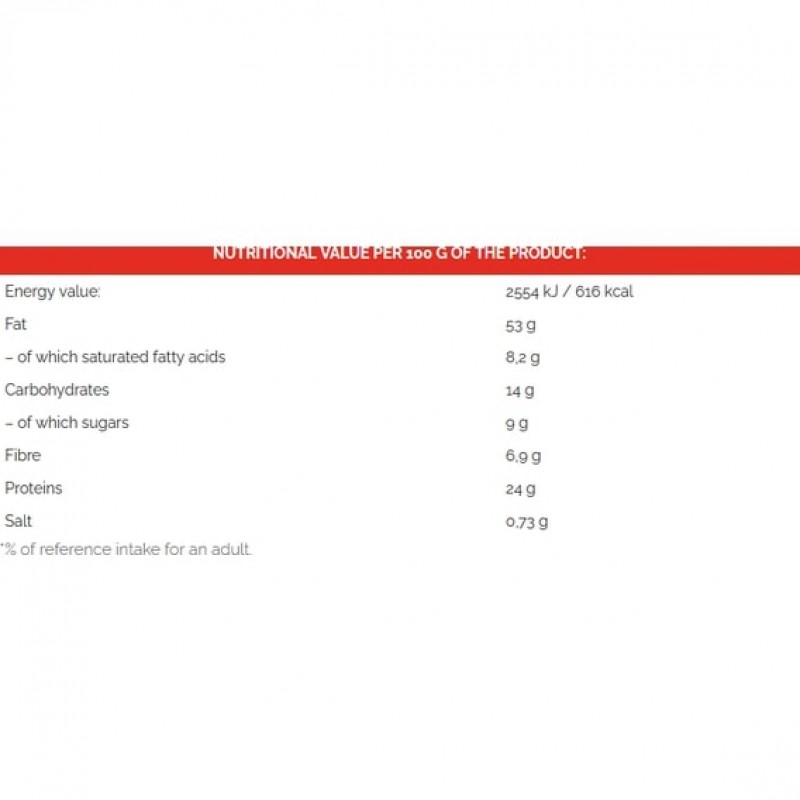 Жареный арахис (арахис) 81,1%, концентрат сывороточного протеина WPC 80 (молоко), подсластитель: ксилит; какао 6%, морская соль.