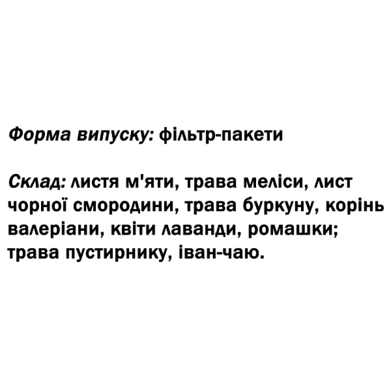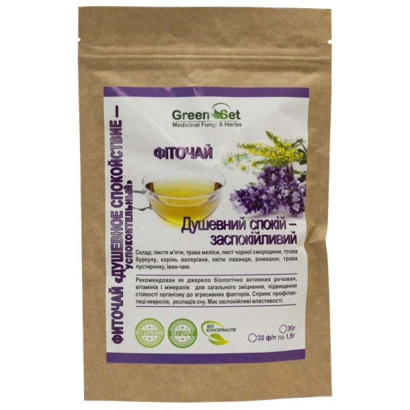 GreenSet Фиточай «Душевный покой - успокаивающий» - травяной сбор, являющийся идеальным сопровождением вечернего отдыха, чтения перед сном, дарит релакс и спокойствие, наполняет сладким ароматом донника, ромашки, карамельными вкусовыми нотками иван-чая, специфическим пряным вкусом мелиссы и валерианы; реально поможет справиться со стрессами, снять нервное напряжение, защитит от эмоциональных провокаций, расстройств сна.