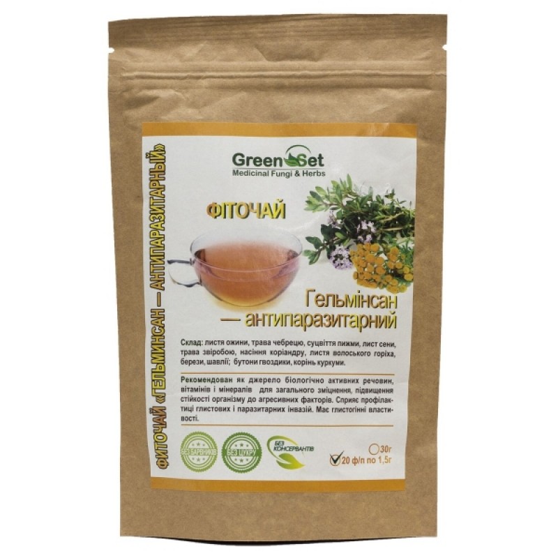 GreenSet Фиточай «Гельминсан - антипаразитарный» - универсальная, нетоксичная, антипаразитарная формула с бальзамическим ароматом трав и листьев ореха, тонким гвоздичным шлейфом и мягкой горечью березовых листьев. Идеально подходит для любого возраста, повышает иммунитет и противовирусную защиту, обеспечивает санацию организма и противостоит инфекциям, воспалениям, глистным и паразитарным инвазиям. Улучшает общее состояние, снижая риск интоксикаций, головных болей, бессонницы, утомляемости, связанных с наличием инвазий.