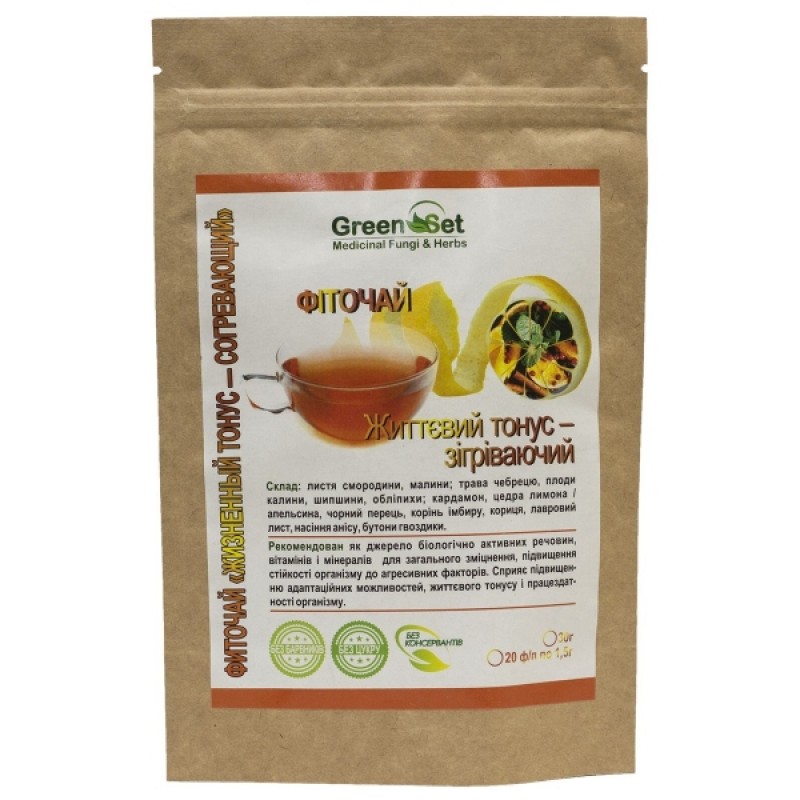 GreenSet «Жизненный тонус - согревающий» - фиточай с сильным пряным, бальзамическим ароматом, остро-горячим вкусом, настоящая альтернатива глинтвейну. Без алкоголя и кофеина способен поднять жизненный тонус, согреть тело и душу, укрепить иммунитет, насытить организм витаминами и минералами, активизировать процессы пищеварения после сытного ужина, подарить хорошее настроение, полное ощущение благополучия и силы.