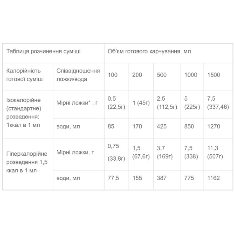 Для приготовления одной порции определите требуемый объем готовой смеси согласно таблице дозировки. Отмерьте необходимый объем чистой кипяченой воды комнатной температуры и необходимое количество смеси согласно таблице дозировки, используя мерную ложечку или весы. Добавьте смесь в воду и тщательно перемешайте до полного растворения.