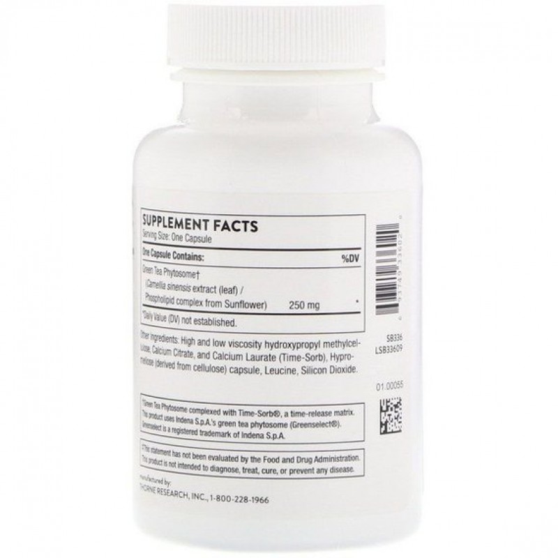 Зеленый чай популярен благодаря своим антиоксидантным свойствам и термогенному (сжиганию жира). Фитосома Thorne's Green Tea содержит мощные антиоксидантные полифенолы‚ и проявляет дополнительный антиоксидантный эффект, помогая поддерживать уровень глютатиона в организме, еще одного важного антиоксиданта. Экстракты зеленого чая могут увеличить естественные энергетические затраты и окисление жиров, тем самым существенно сжигая калории. Полифенолы зеленого чая также обеспечивают защиту печени и помогают поддерживать нормальный воспалительный ответ организма на окислительные стрессоры. Фитосома Thorne's Green Tea оптимально усваивается; например, одно исследование показало, что пиковая концентрация в крови важного компонента полифенолов EGCG из комплекса фитосом зеленого чая, измеренная в течение шести часов, была почти в два раза выше, чем в некомплексном экстракте зеленого чая.